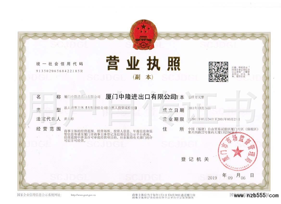 | 發(fā)證機(jī)構(gòu): | 廈門市市場監(jiān)督管理局 | 發(fā)證時(shí)間 : | 2019-09-06 |