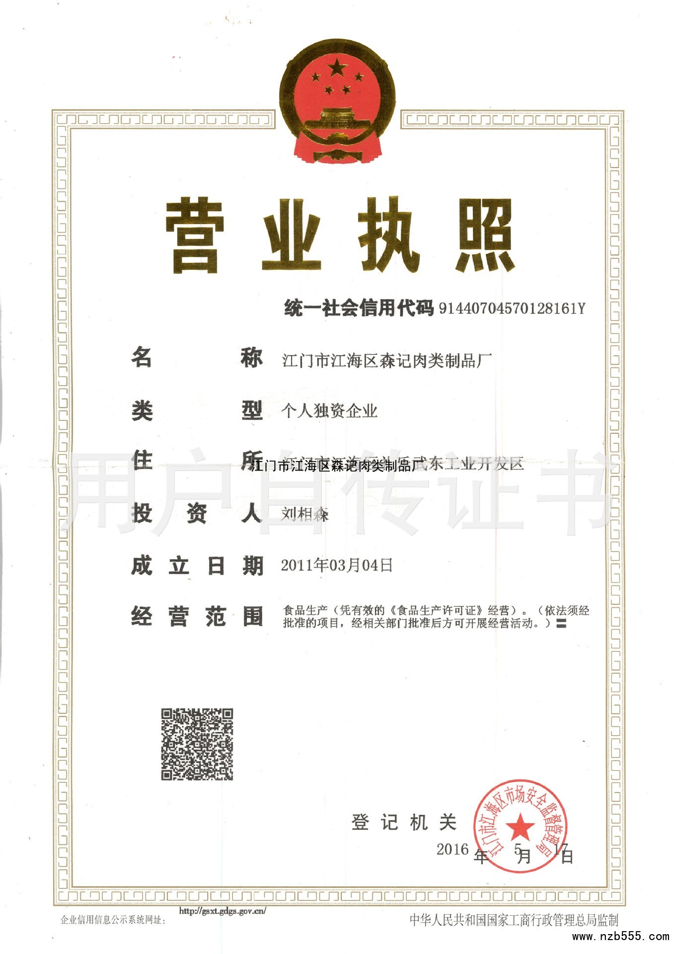 榮譽(yù)資質(zhì) 江門(mén)市江海區(qū)森記肉類制品
