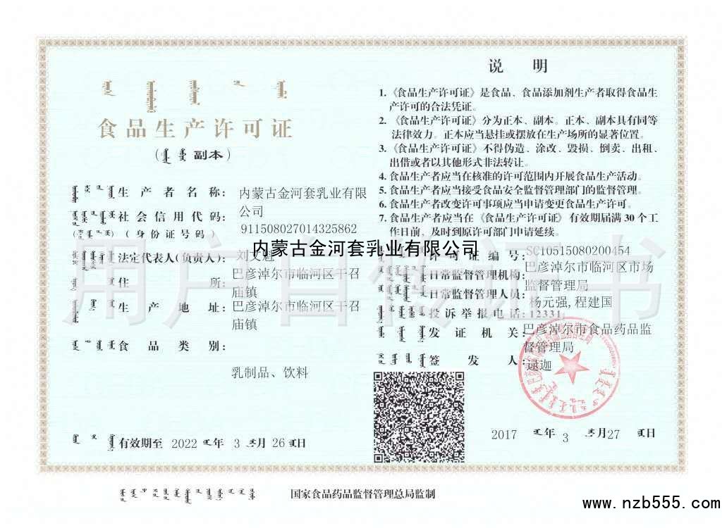 | 發(fā)證機(jī)構(gòu): | 巴彥淖爾市食品藥品監(jiān)督管理局 | 發(fā)證時(shí)間 : | 2017-03-27 |