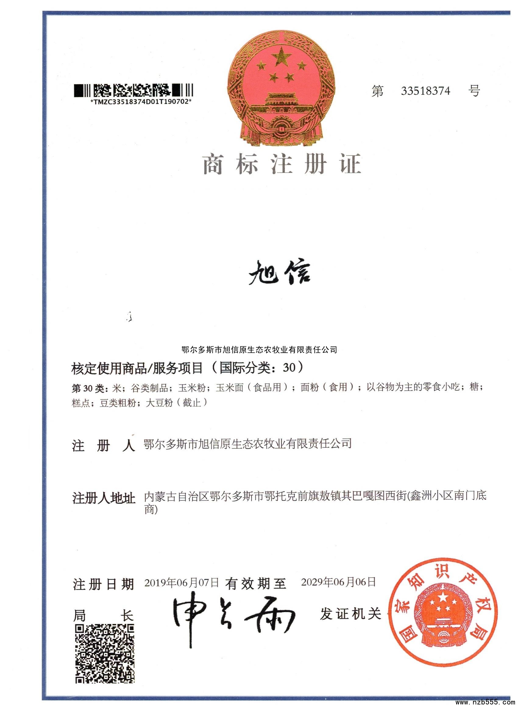 榮譽(yù)資質(zhì) 商標(biāo)注冊(cè)證 旭信 第30類