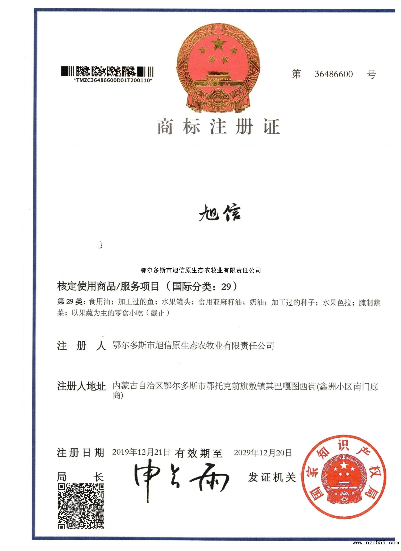 商標注冊證 旭信 第二十九類