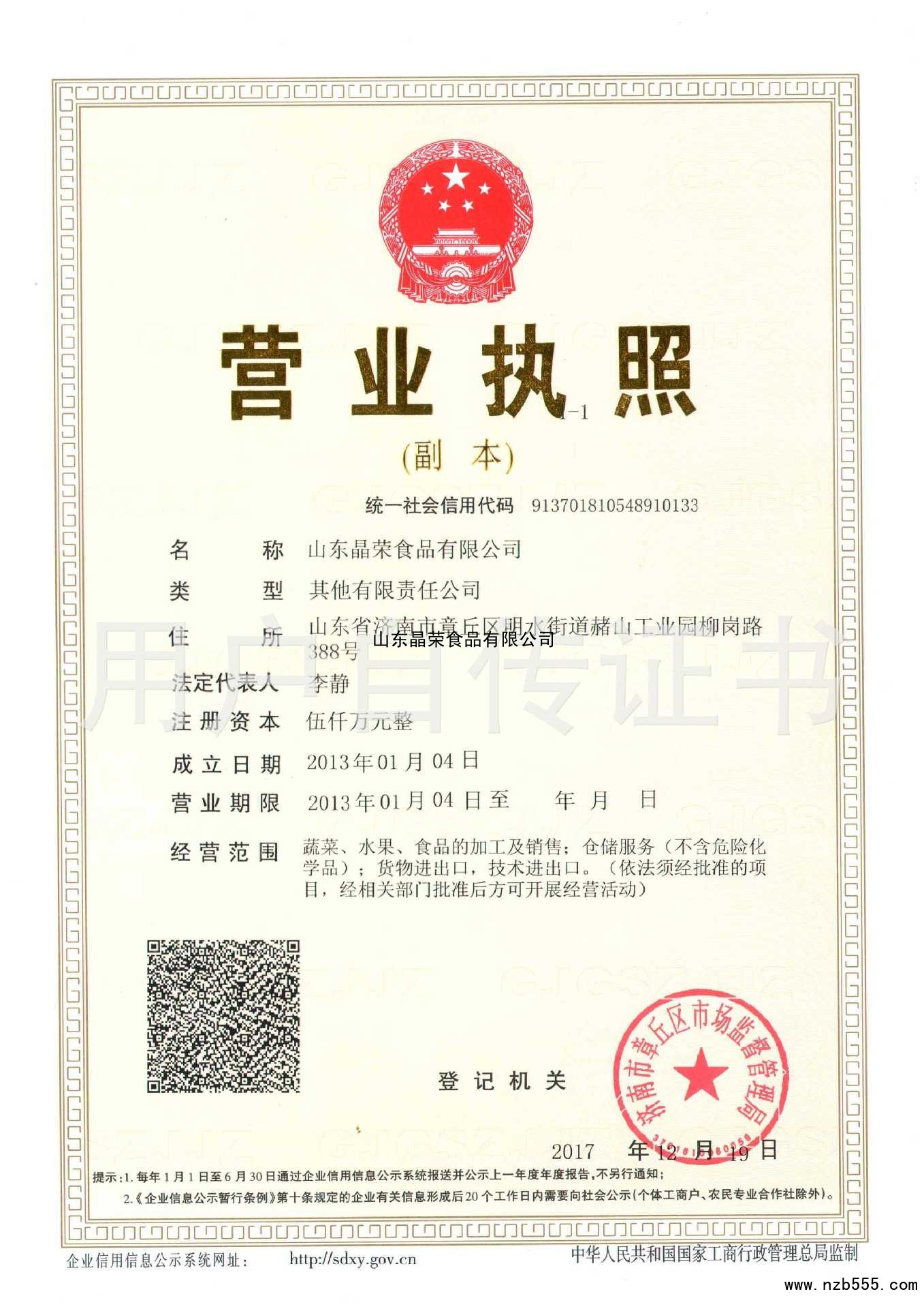 | 發(fā)證機(jī)構(gòu): | 濟(jì)南市章丘區(qū)市場(chǎng)監(jiān)督管理局 | 發(fā)證時(shí)間 : | 2017-12-19 |