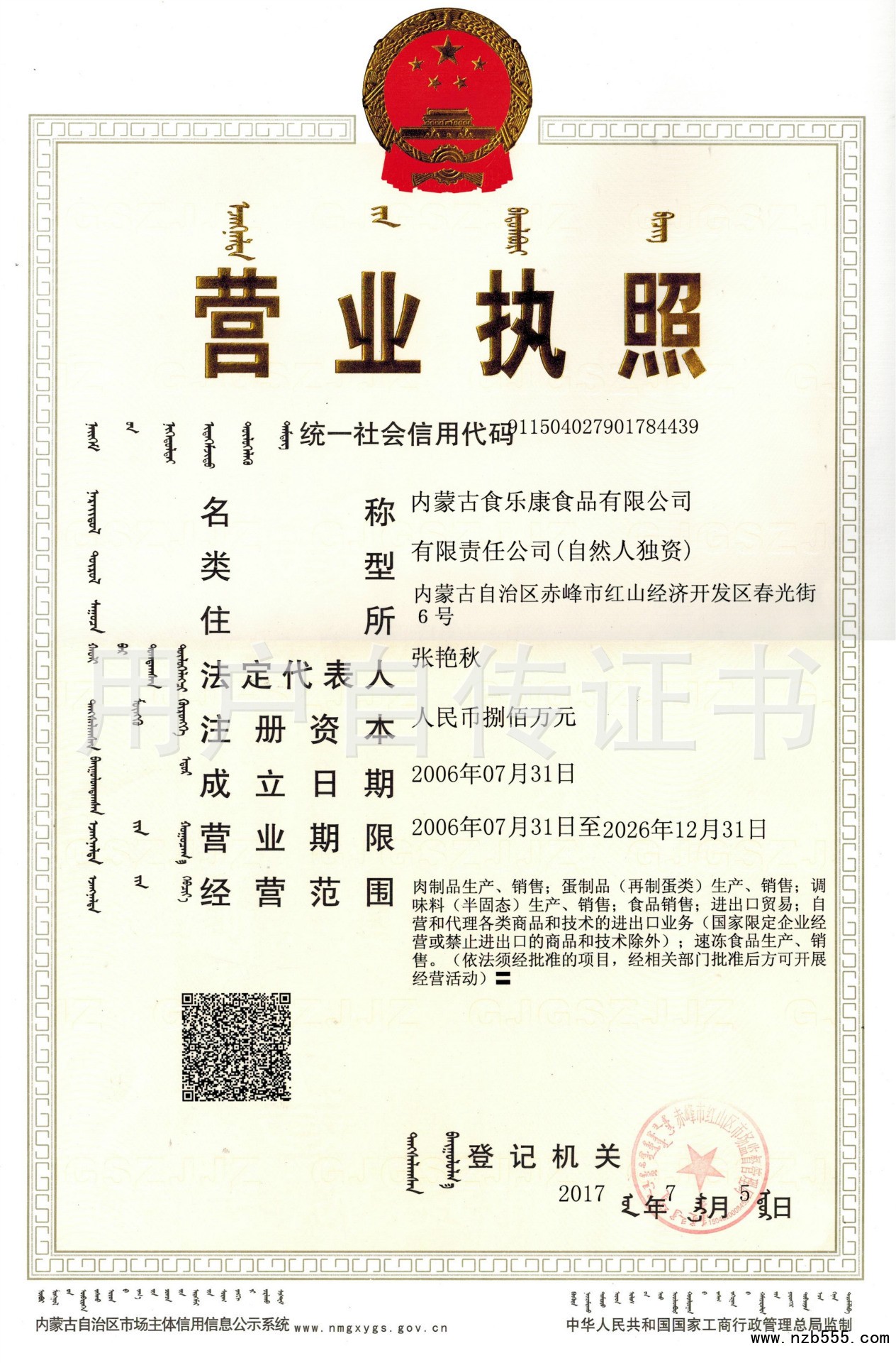 | 發(fā)證機(jī)構(gòu): | 赤峰市市場監(jiān)督管理局 | 發(fā)證時(shí)間 : | 2017-07-05 |