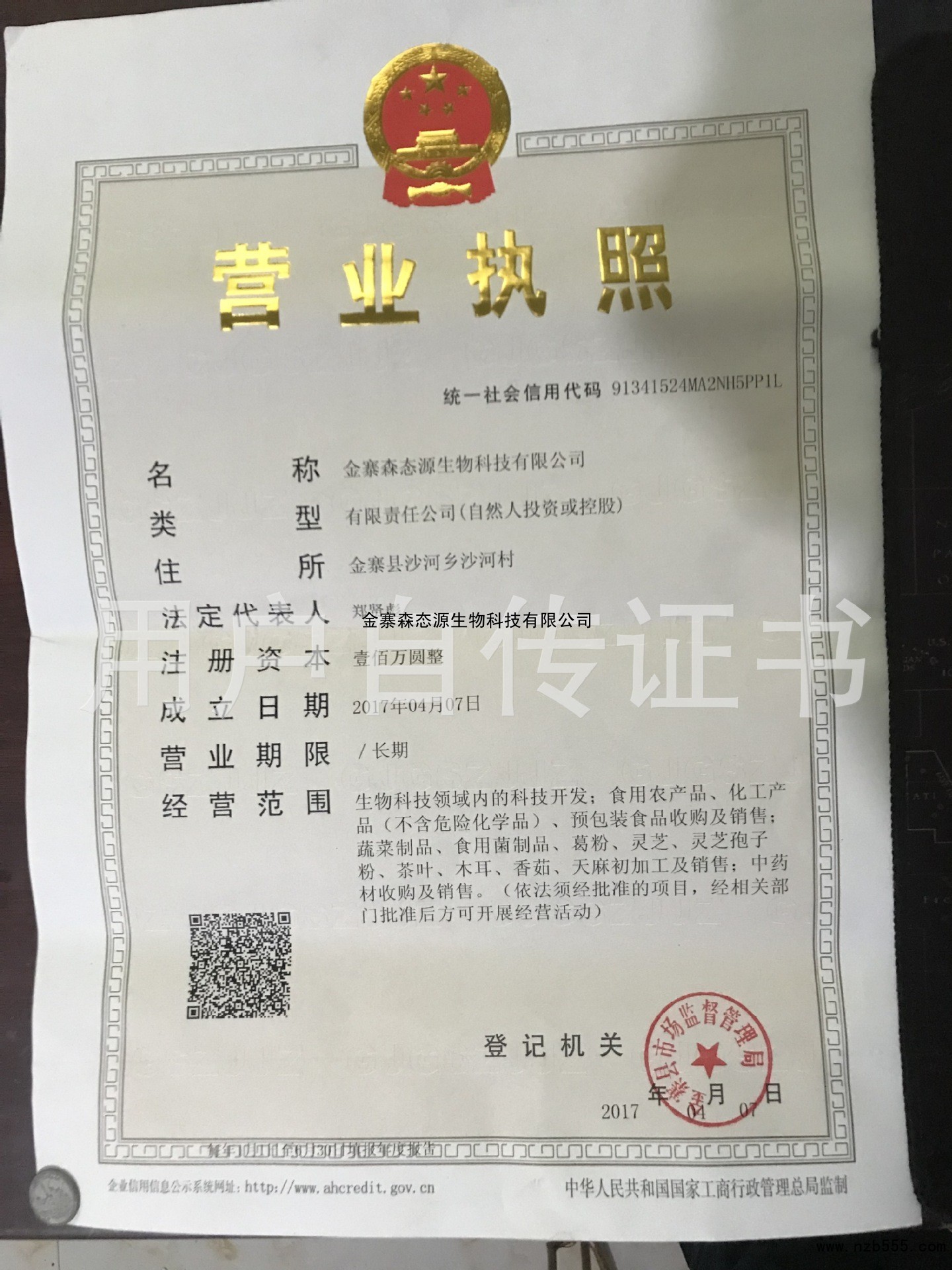 | 發(fā)證機(jī)構(gòu): | 金寨縣市場監(jiān)督管理局 | 發(fā)證時(shí)間 : | 2017-04-07 |