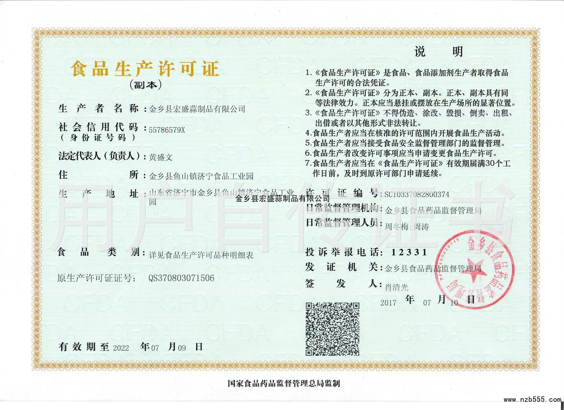 | 發(fā)證機(jī)構(gòu): | 金鄉(xiāng)縣食品藥品監(jiān)督管理局 | 發(fā)證時間 : | 2017-07-10 |
