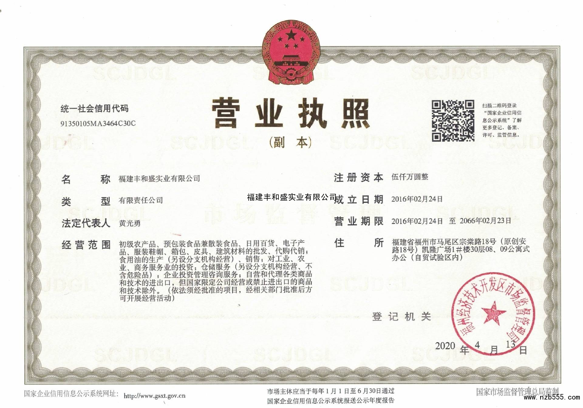 | 發(fā)證機(jī)構(gòu): | 福州經(jīng)濟(jì)開(kāi)發(fā)區(qū)市場(chǎng)監(jiān)督管理局 | 發(fā)證時(shí)間 : | 2020-04-13 |