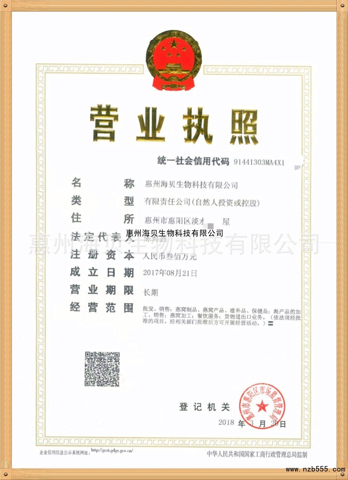 | 發(fā)證機(jī)構(gòu): | 惠州市惠陽區(qū)市場監(jiān)督管理局 | 發(fā)證時間 : | 2018-03-20 |